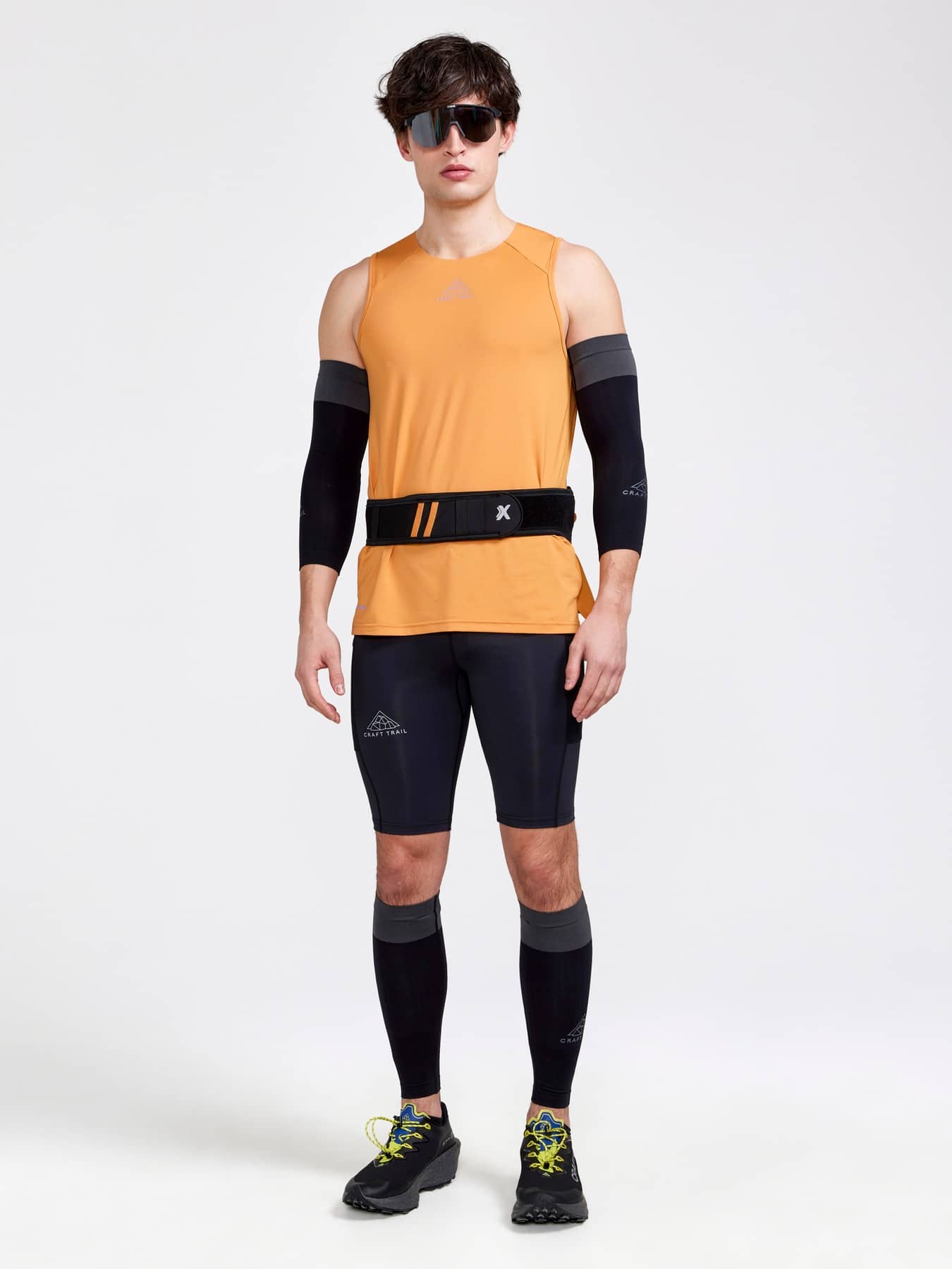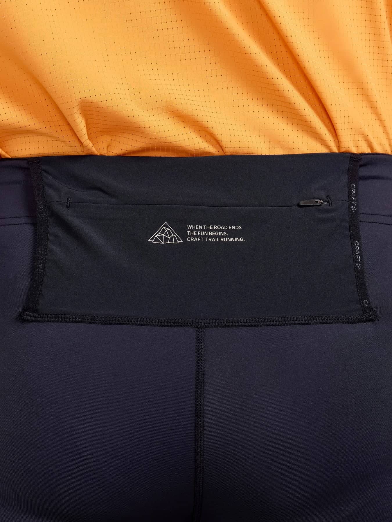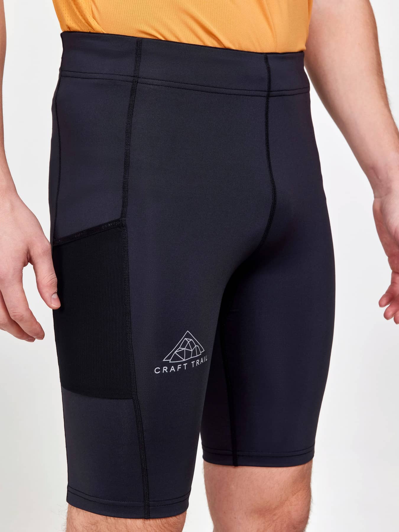 Pro-grade trailrunning short tights made of recycled polyamide featuring wide elastic waistband with terry inside and drawstring for great fit and comfort. The tights come with two elastic mesh pockets at each side to hold essentials for long runs.