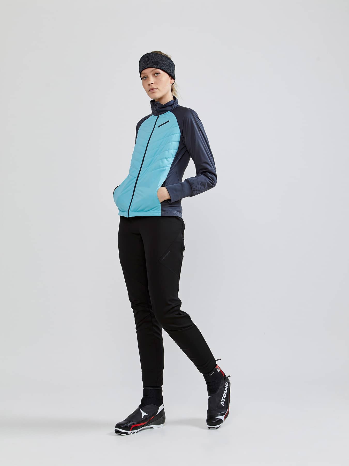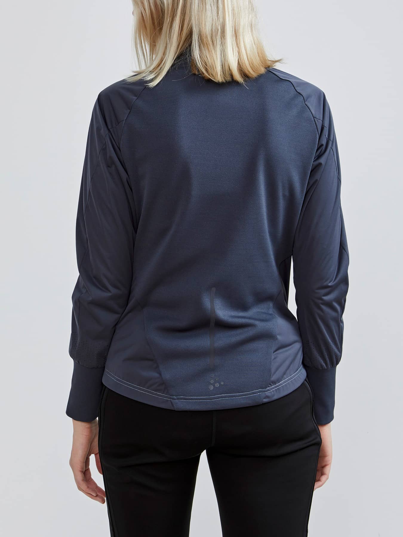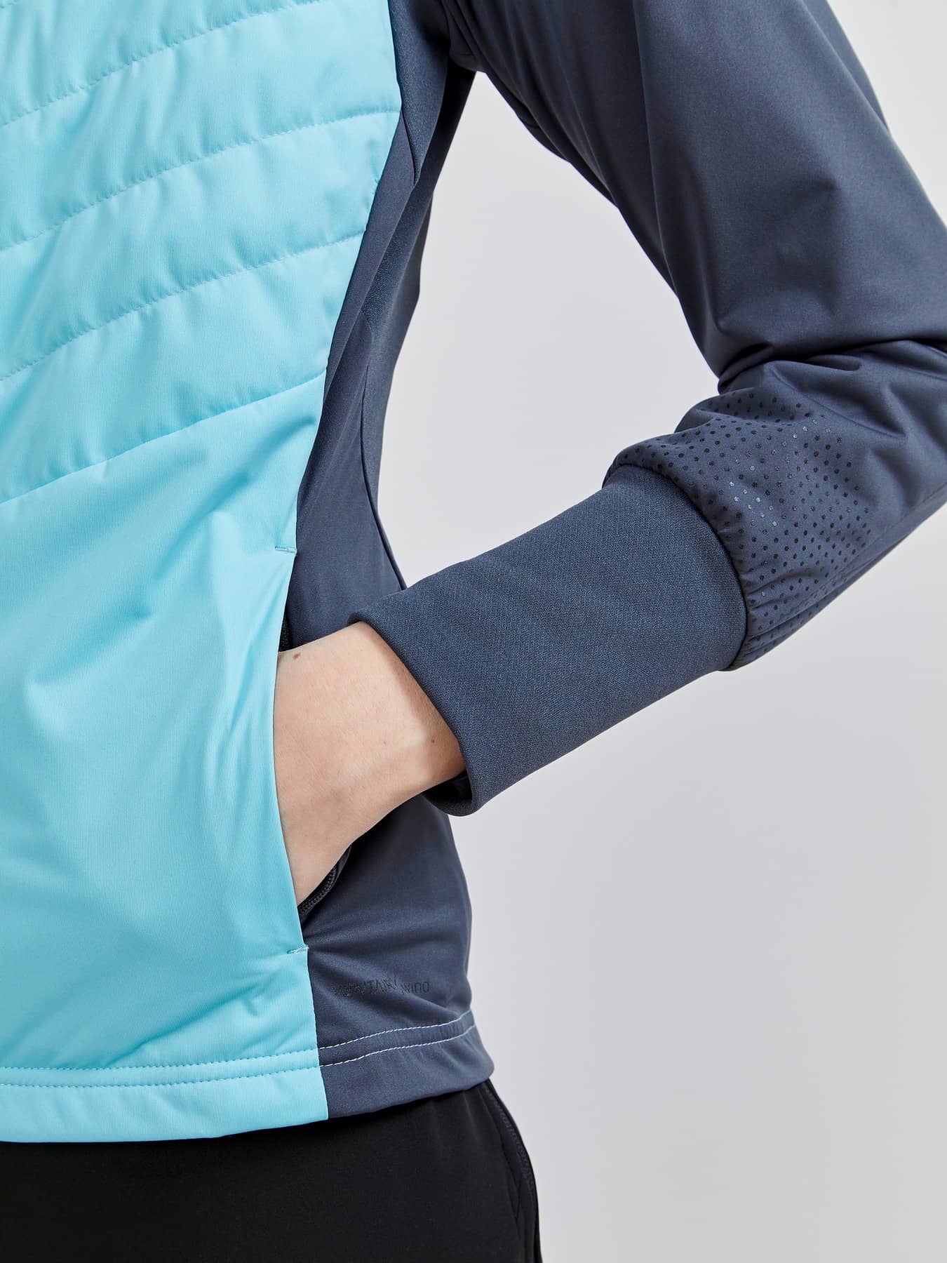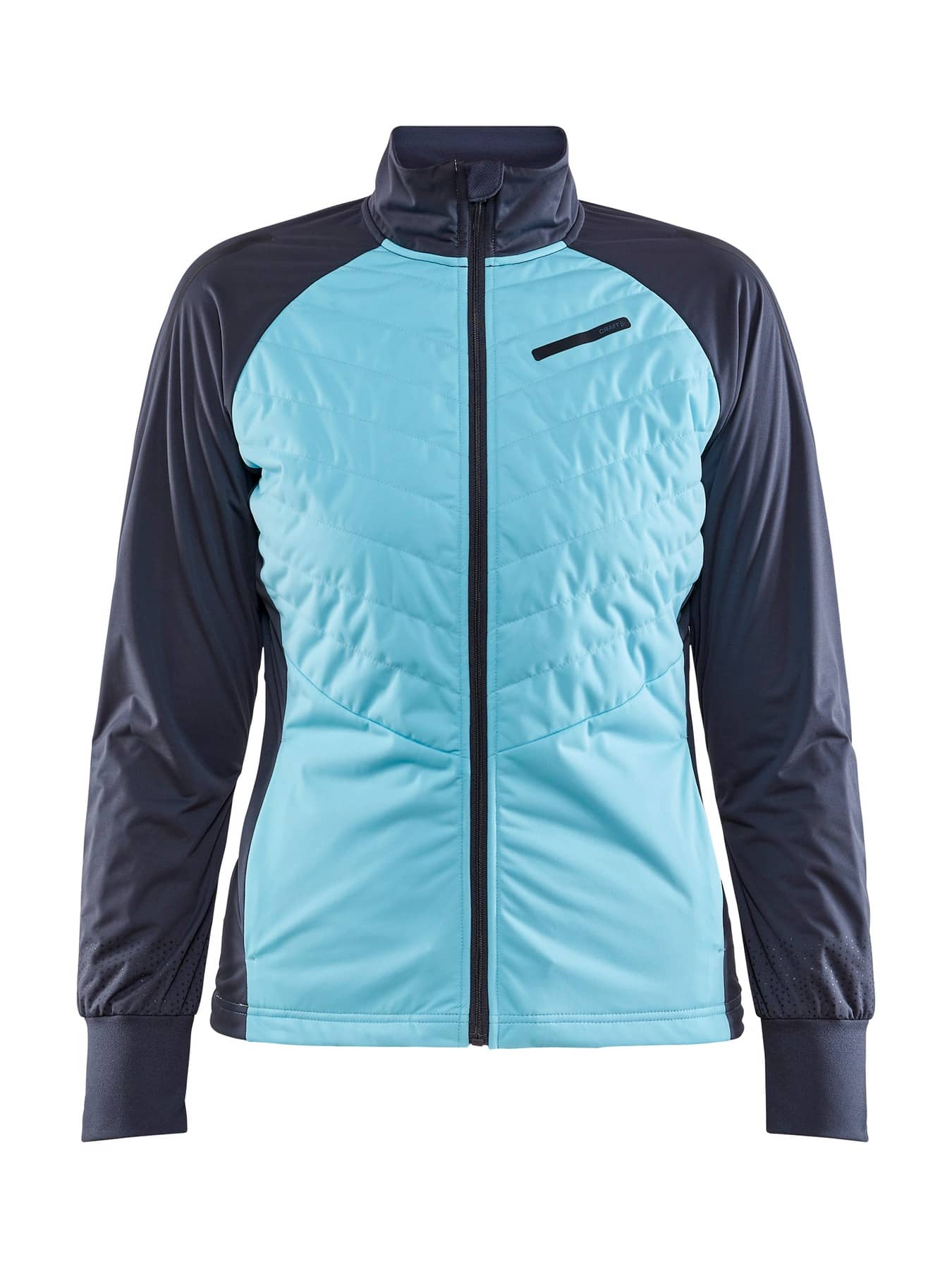 Warm jacket in recycled fabrics with windproof front and pre-shaped sleeves. - Elastic, lightweight and windproof fabric at front and back with 50% recycled polyester. - Brushed fleece in 100% recycled polyester. - Quilted light-padded front and back for warmth and comfort - Reflective prints and tapes at front and back - Two zippered front pockets - Brushed Flex fleece at inner collar