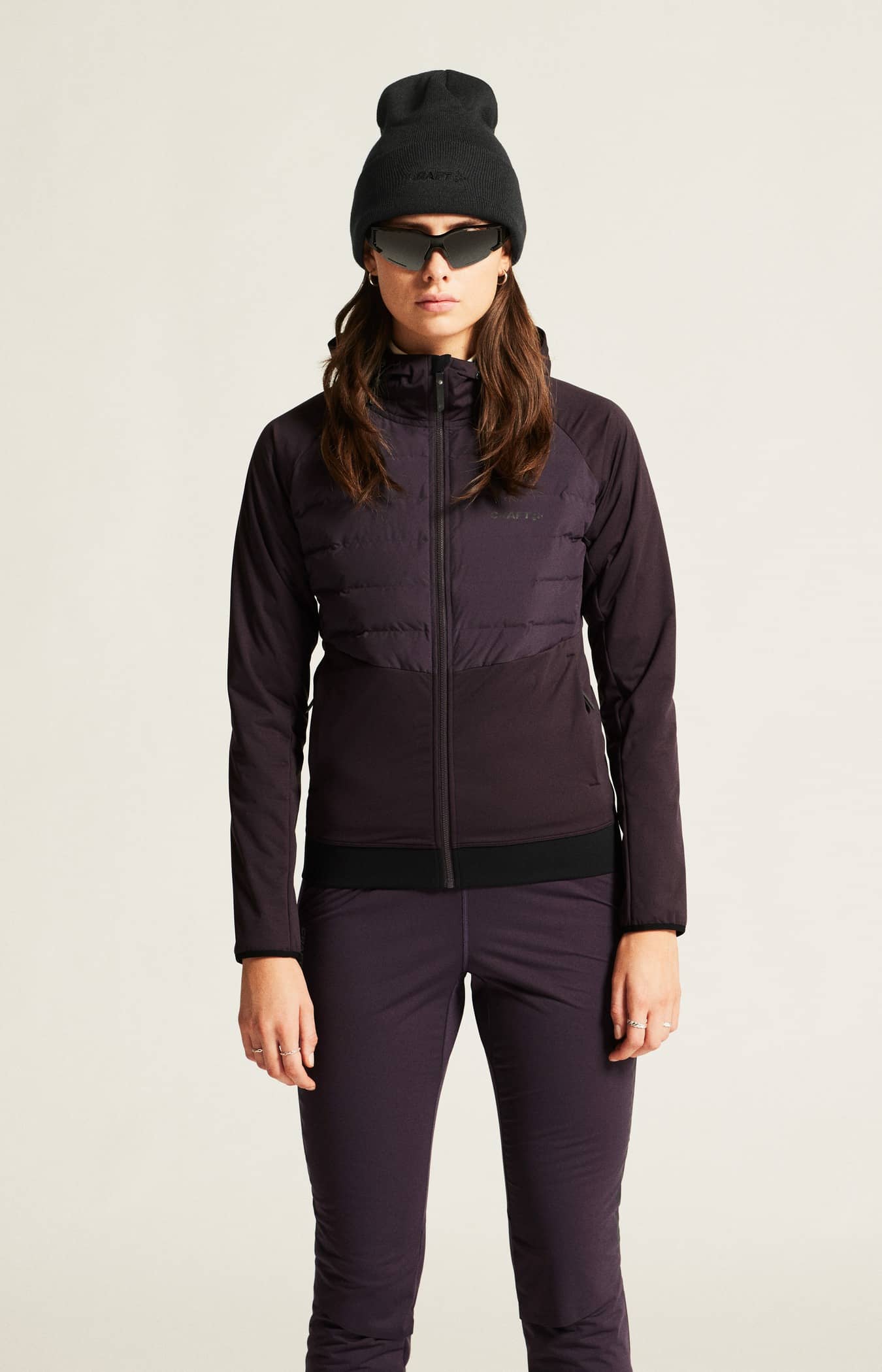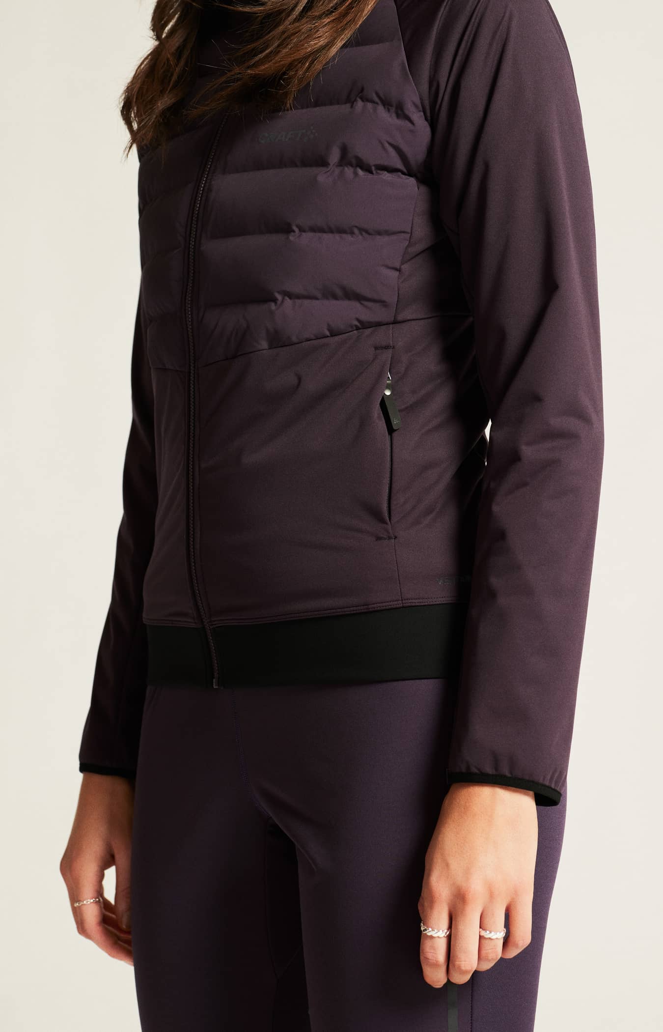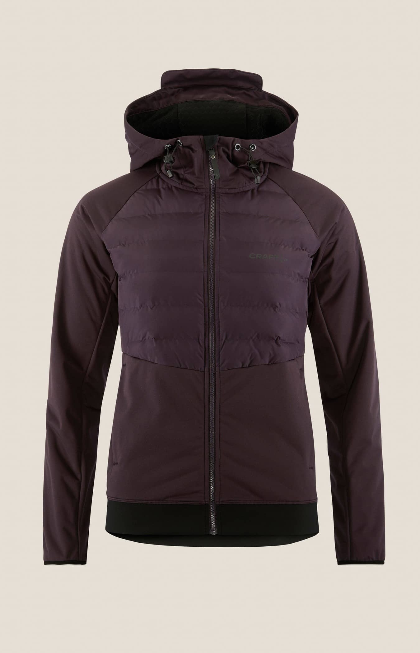 Ski jacket with padded front and hood, raglan sleeves and elastic rib at bottom. - Light padded upper front body for warmth and comfort - Adustable padded & protective hood for warmth & comfort - Breathable 3L fabric at lower front, sleeves & back - Zip side pockets - Elastic rib at bottom for snug fitting - Raglan sleeve for full movement