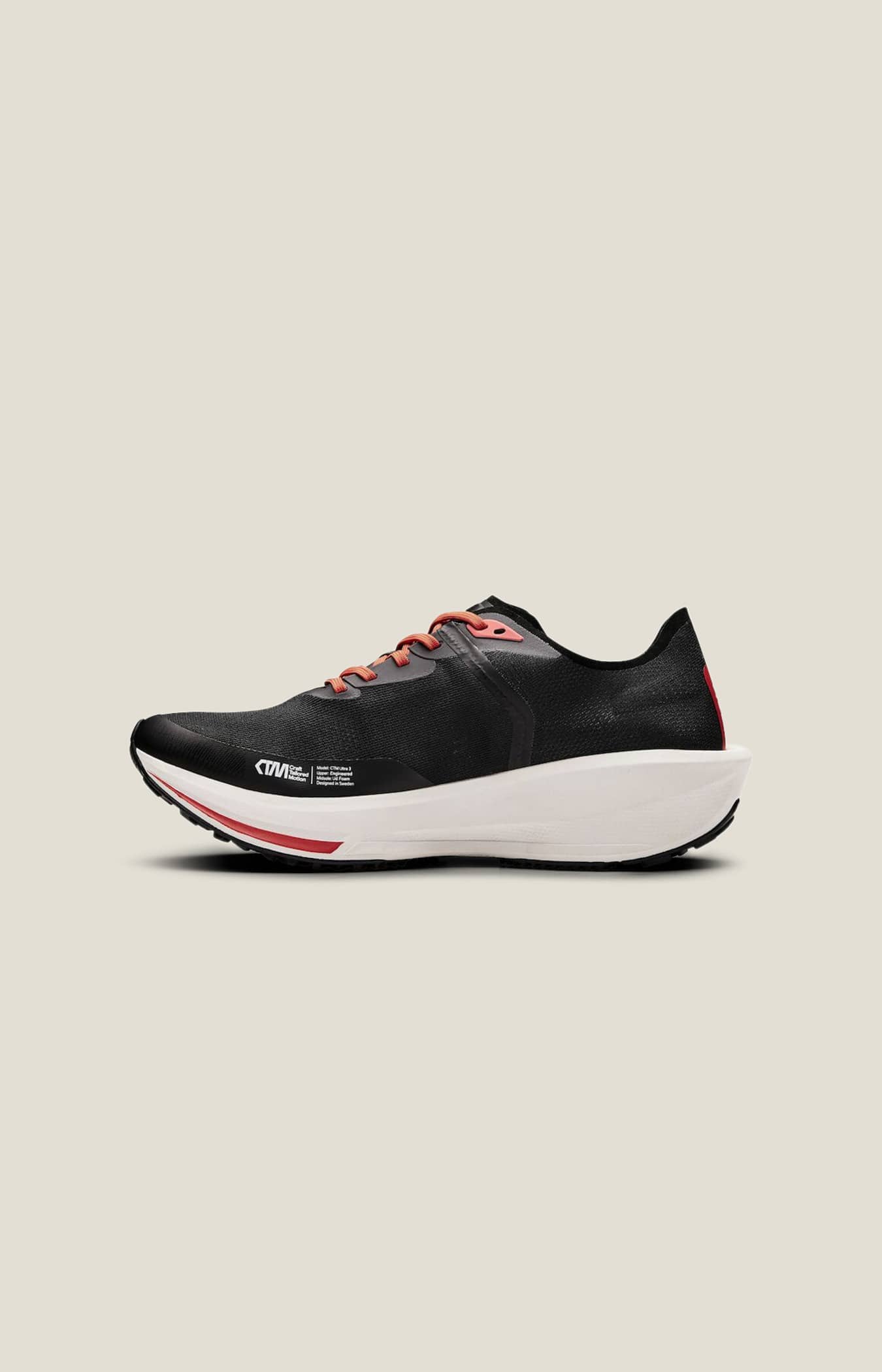 CTM Ultra 3 is a lightweight premium running shoe designed for dedicated and discerning athletes who run with a purpose. The third generation of the highly popular CTM Ultra platform, this shoe is perfect for high-mileage running athletes. It performs and responds at varying distances and features a Ud Foam™ midsole and the newest evolution of a one piece engineered mesh upper with asymmetrical lacing system. Fast, lightweight and amazingly durable, you can pile up the miles in this premium, technical running shoe. Ultra Built for speed and durability, the Ultra concept includes lightweight and fast running shoes that are capable on varying surfaces. The platform provides a perfect balance between stack height, drop and foot angle to enable runners to keep form as effortlessly as possible, which is essential when you want to run fast during a sustained period of time. CTM – the best of the best CTM stands for Craft Tailored Motion and includes the most advanced materials and the latest innovations for the most demanding athletes. When superior function, maximum energy return and low weight is the name of your game, this is where you come to play. Ud Foam™ Ud Foam™ is a lightweight and durable midsole foam that delivers consistent propulsion during ultra-distance running. This EVA-based foam, which is an improved version of the successful Vault Foam™, adds a unique chemical compound for enhanced rebound and durability. Fast, light and long-lasting are the main characteristics of this high-quality midsole foam. Craft Regular Fit Snug in heel and mid foot with excellent lock-in capability and additional room in forefoot for superior comfort and performance. • One-piece engineered mesh upper • Ud Foam™ midsole ? lightweight, ultra-high rebound, and ultra-durable • Ultra Rebound™ insole for maximum energy return against the foot • 3-piece lugged traction rubber outsole capable on road or light trail surfaces and in varying climate conditions • Craft Regular Fit • Weight: 265 g in size UK8 • Stack height: heel 40 mm, forefoot 30 mm • Drop: 10 mm