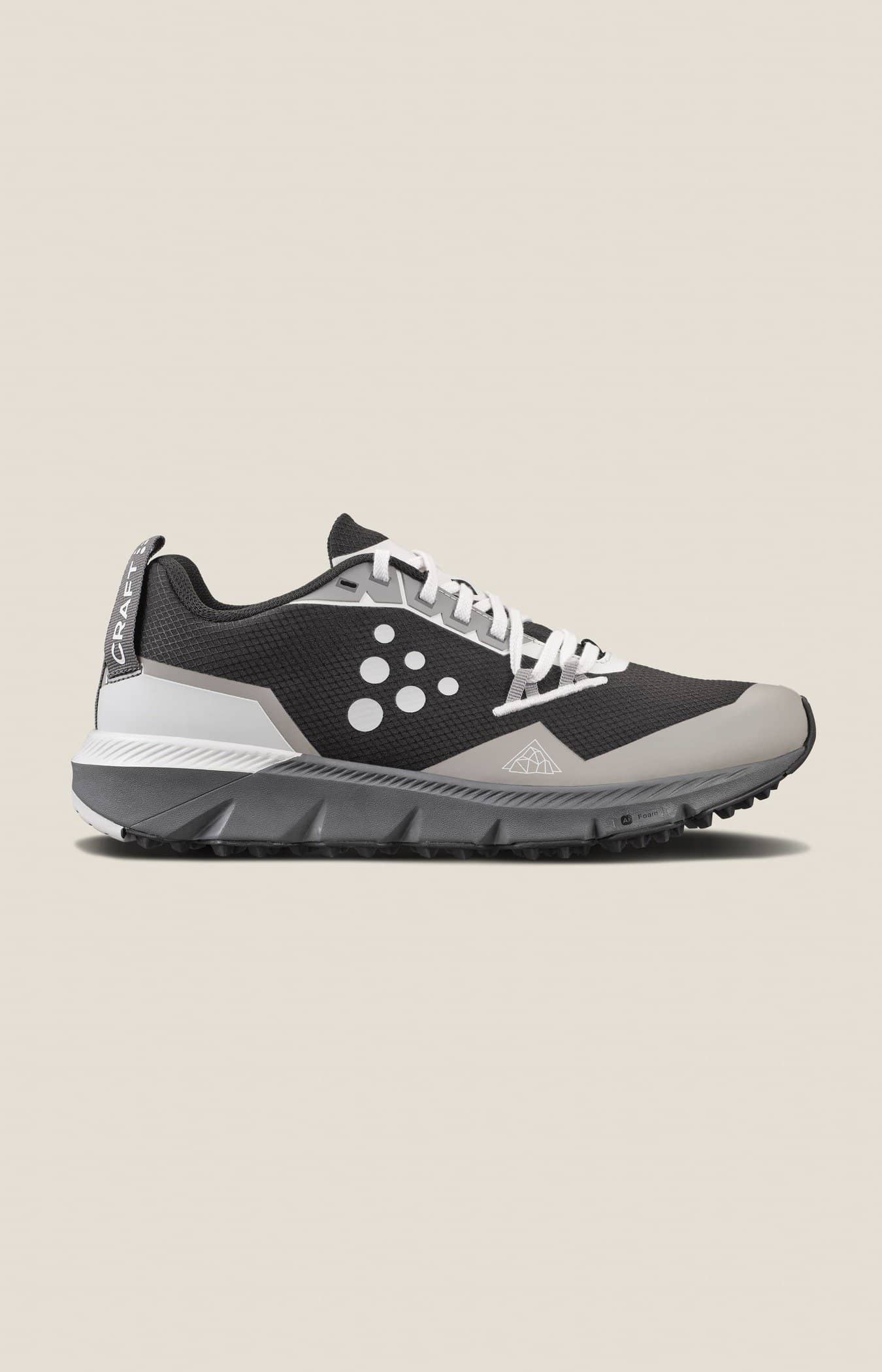 Nordic Trail 2 is an all-terrain trail shoe that seamlessly blends road comfort with off-road durability. This technically advanced trail-running shoe features our improved Ud Foam™ midsole, delivering a responsive ride and great comfort across various surfaces. The shoe's mesh upper is made from recycled polyamide and comes with TPU reinforcements in critical areas for excellent breathability and protection. It also features a durable outsole with an organic-structured tread for optimal traction on varying off-road surfaces. Whether you're navigating rugged trails or smooth roads, this shoe provides the flexibility and light protection you need for your journey. Ud Foam™ Ud Foam™ is a lightweight and durable midsole foam that delivers consistent propulsion during ultra-distance running. This EVA-based foam includes a unique chemical compound for enhanced rebound and durability. Fast, light and long-lasting are the main characteristics of this high-quality midsole foam. CRAFT Regular Fit Snug in heel and mid foot with excellent lock-in capability and additional room in forefoot for superior comfort and performance. • Durable mesh upper made from 80% recycled polyamide • Lightweight and durable Ud Foam™ midsole • Organic-structured outsole tread for optimal traction • TPU toe guard • Laces made from 100% recycled polyester • Foam sock liner made from 50% recycled material • CRAFT Regular Fit • Weight: xxx g in size UK8 • Stack height incl insole: heel 28 mm, forefoot 19,5 mm • Drop: 8.5 mm