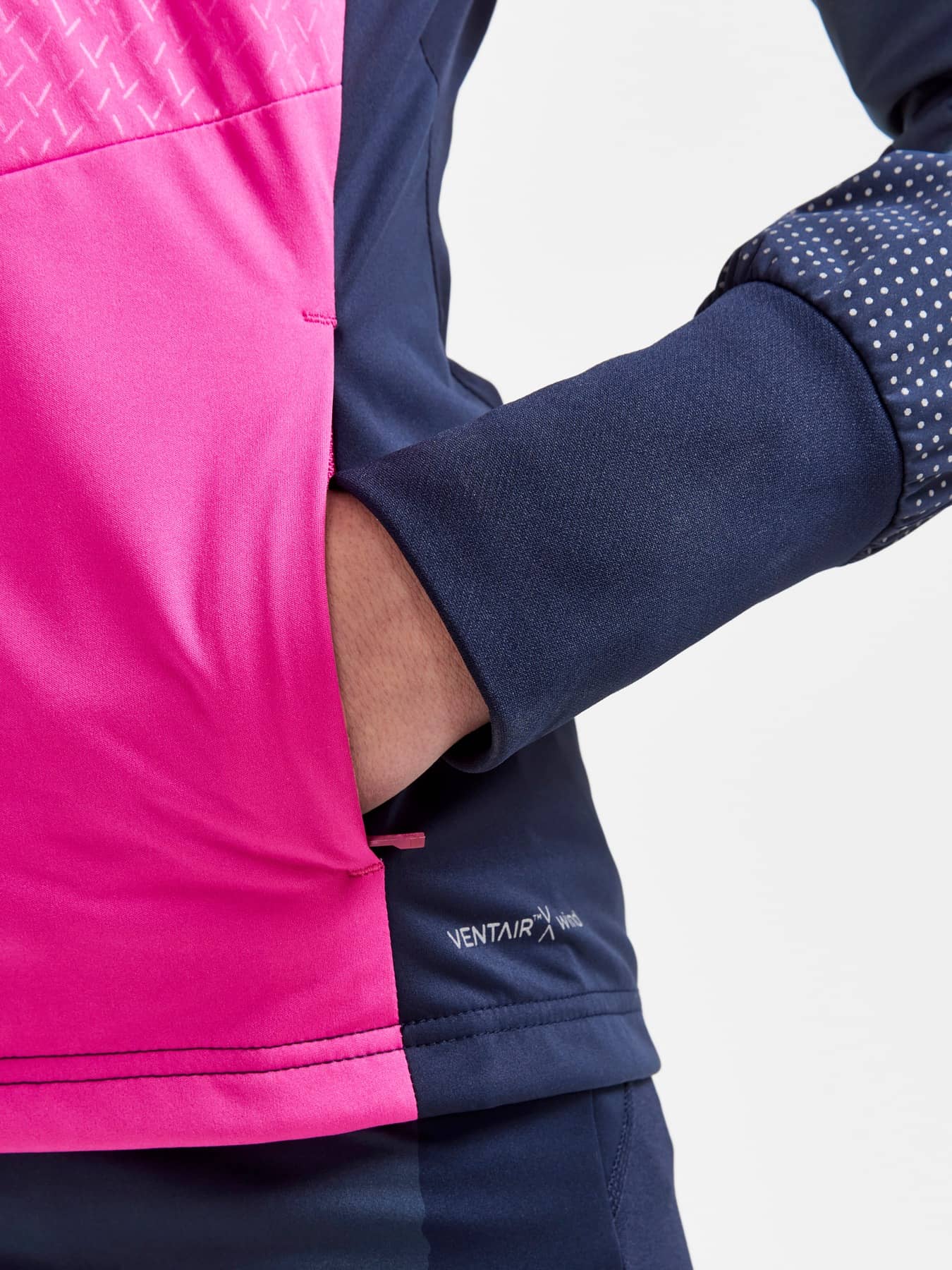 Warm jacket in recycled fabrics with windproof front and pre-shaped sleeves. - Elastic, lightweight and windproof fabric at front and back with 50% recycled polyester. - Brushed fleece in 100% recycled polyester. - Quilted light-padded front and back for warmth and comfort - Reflective prints and tapes at front and back - Two zippered front pockets - Brushed Flex fleece at inner collar