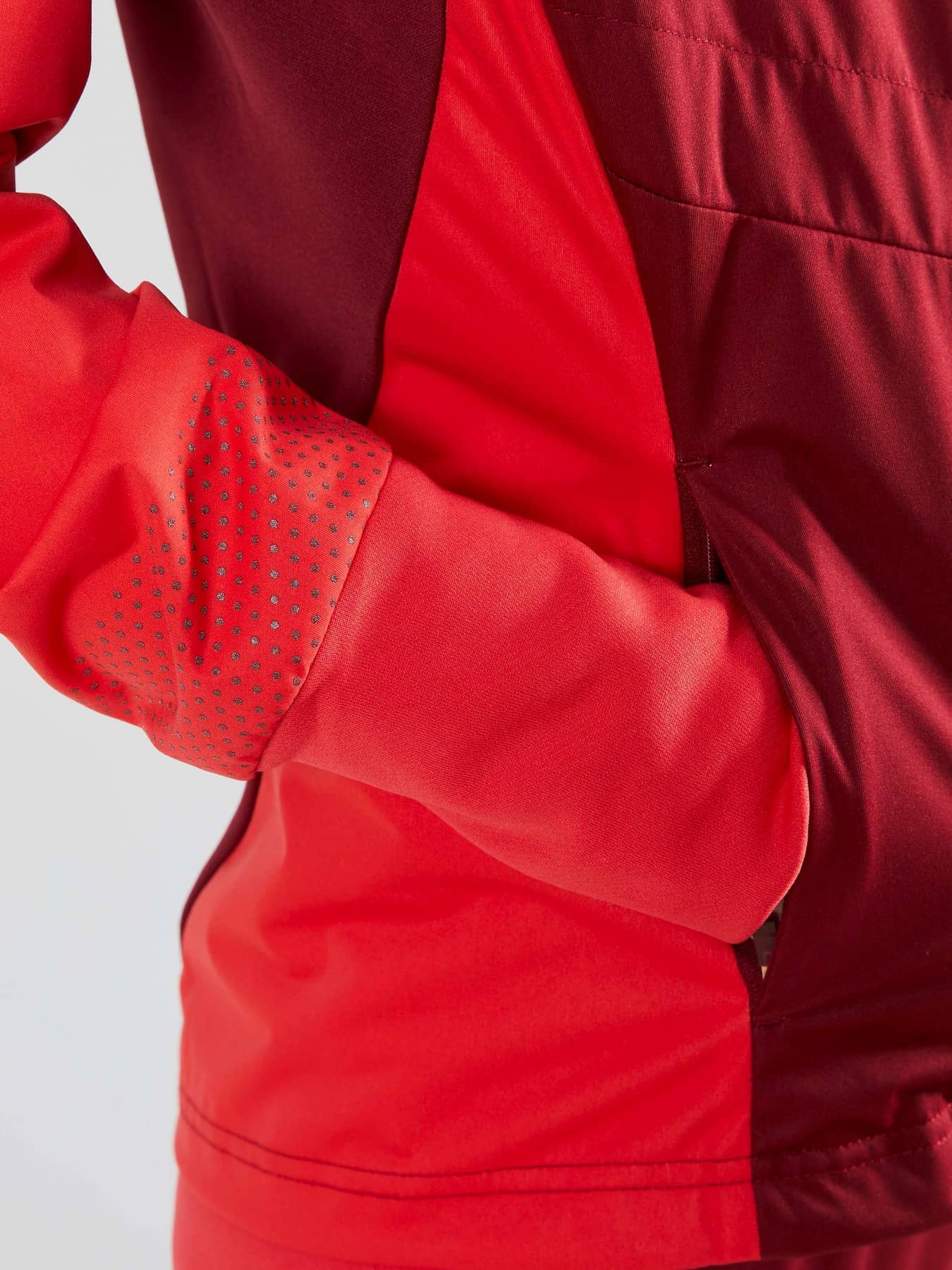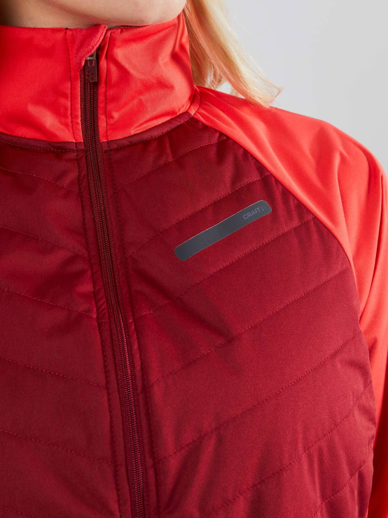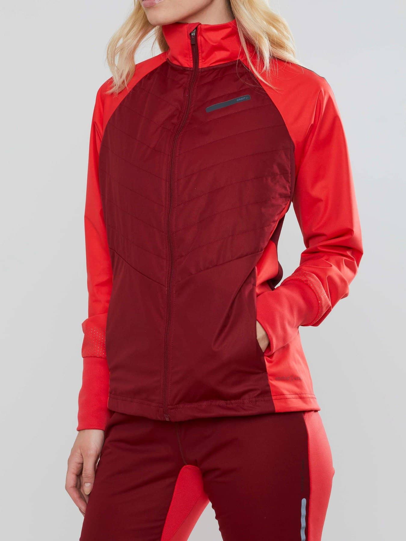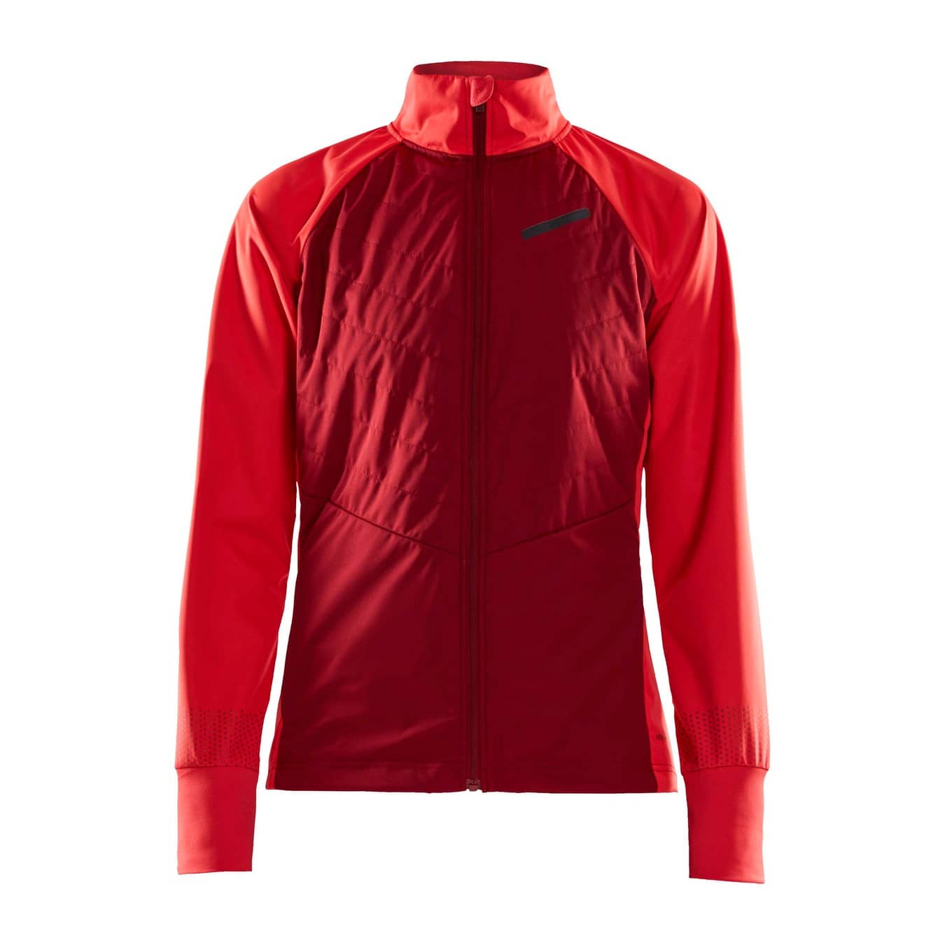 Warm jacket in recycled fabrics with windproof front and pre-shaped sleeves. - Elastic, lightweight and windproof fabric at front and back with 50% recycled polyester. - Brushed fleece in 100% recycled polyester. - Quilted light-padded front and back for warmth and comfort - Reflective prints and tapes at front and back - Two zippered front pockets - Brushed Flex fleece at inner collar