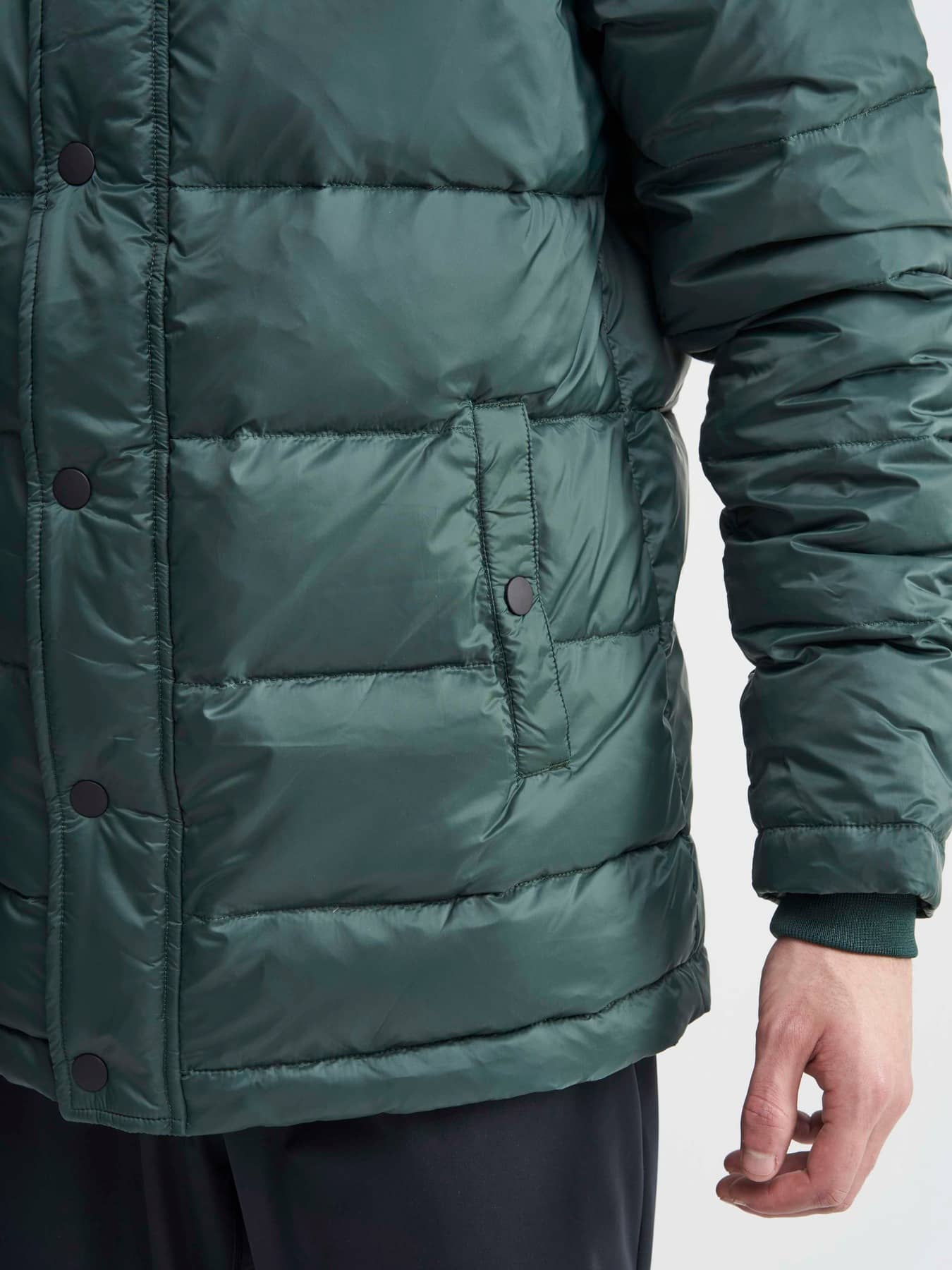 Warm down jacket with shiny yoke, detachable hood, inner pocket and two side pockets. - Two side pockets - Detachable hood - High padded collar - Rib cuff at sleeve end - Innerpocket with zip - Adjustable waist