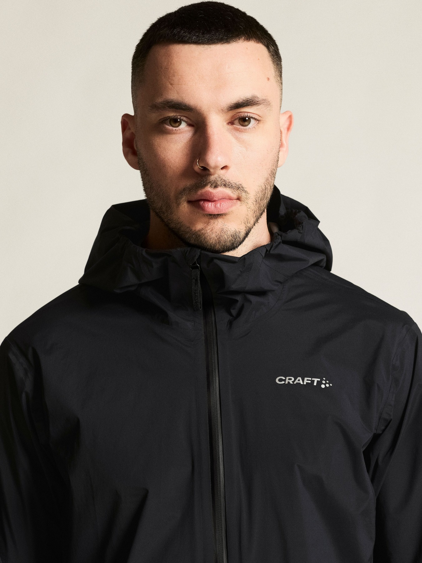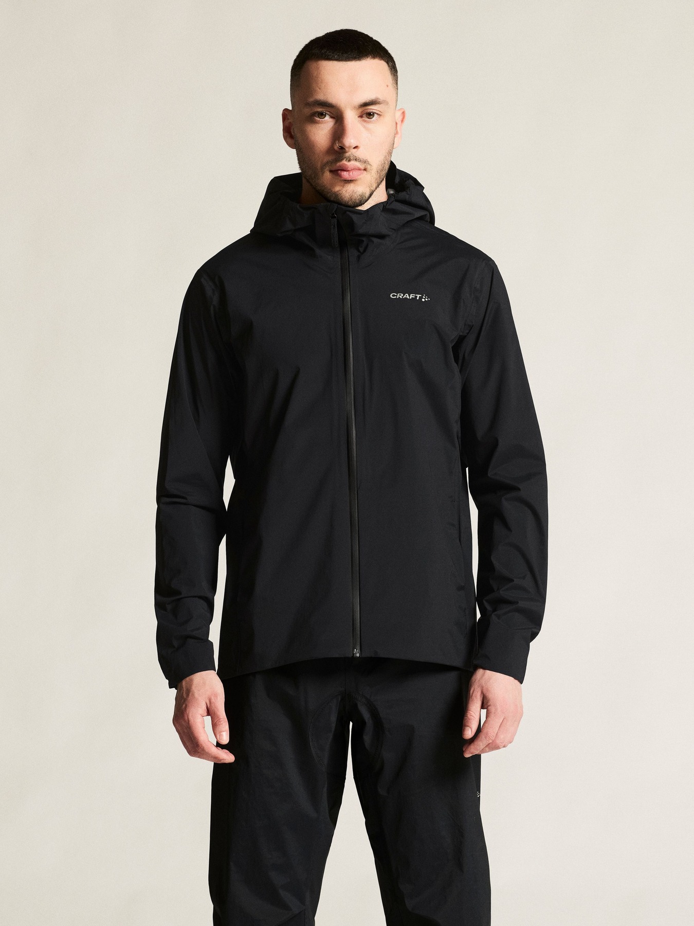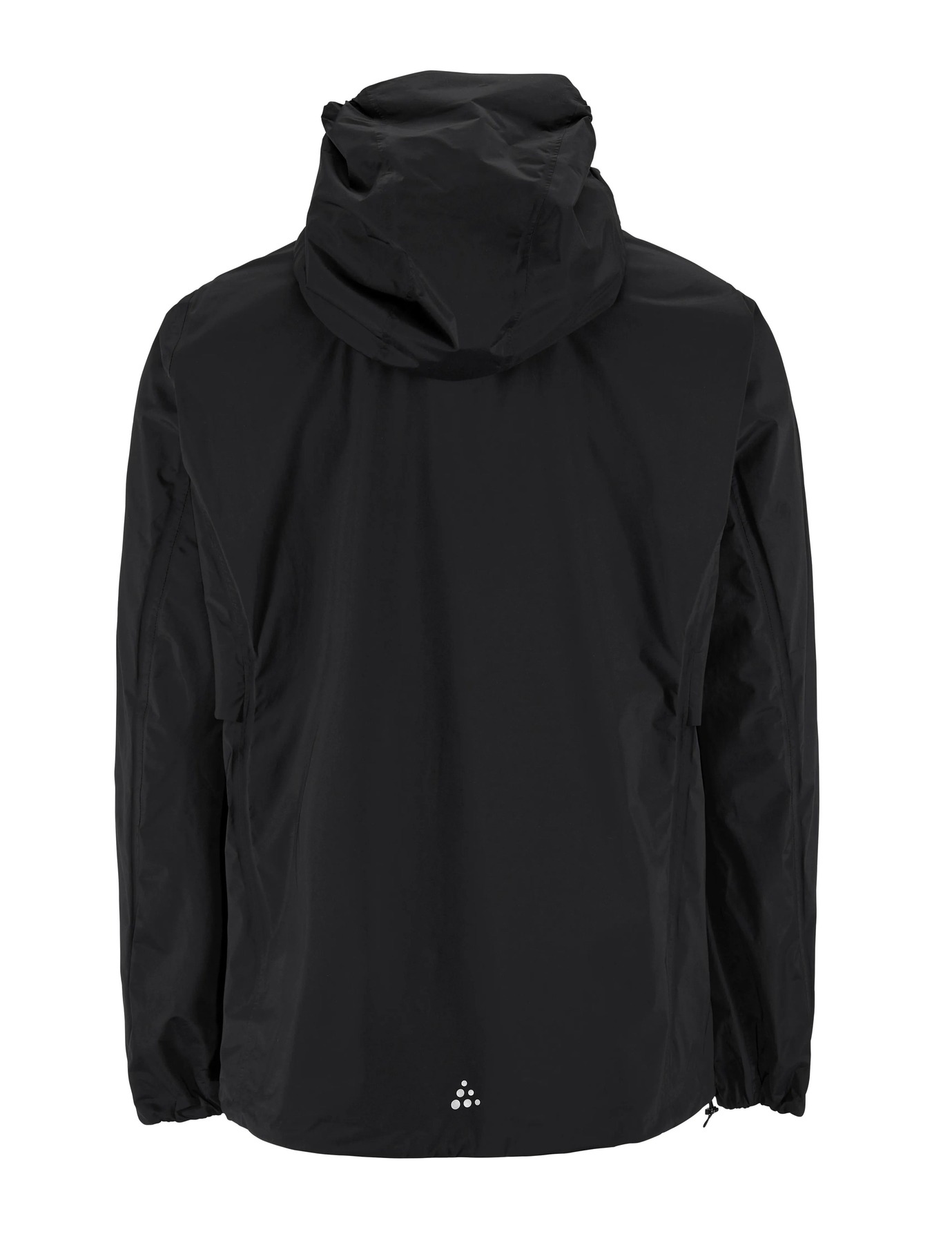 Jakken er laget av vind- og vanntett stoff og har teipede sømmer for full beskyttelse mot været. I tillegg har sykkeljakken ventilasjonsåpning i sidene, to glidelåslommer foran og elastisk kant i ermene og nederst som holder regn og vind unna. Den har også en hjelmkompatibel hette som kan brettes bort og festes med en knapp på baksiden av kragen.