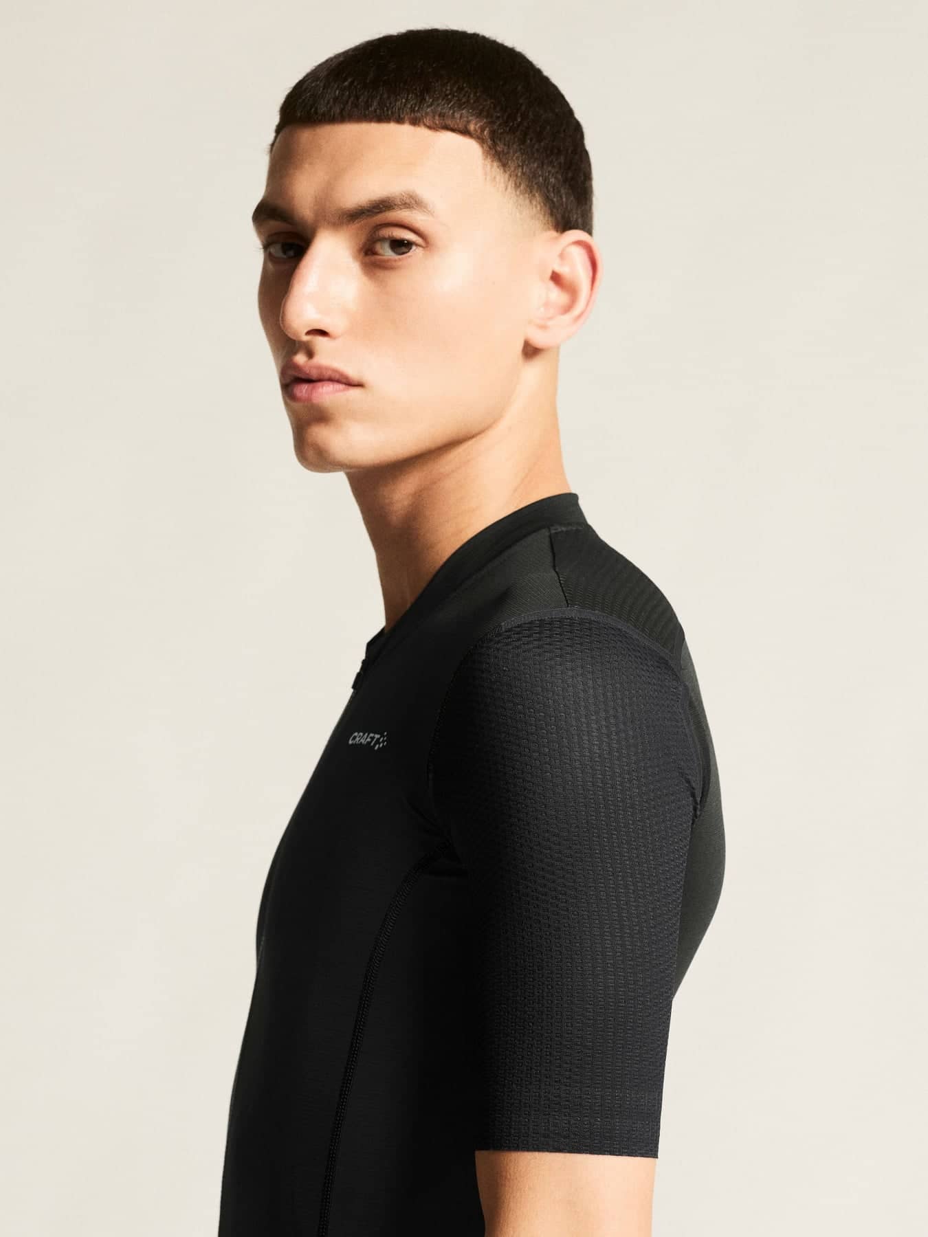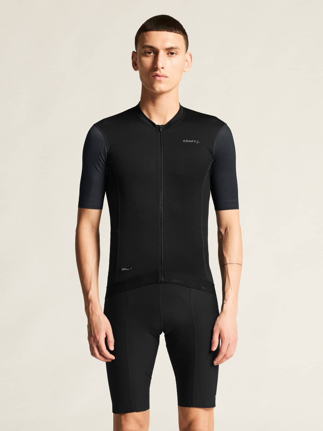 Denna innovativa cykeltröja kombinerar strategiskt placerade materialstrukturer för optimal aerodynamik, inklusive mesh med dimple-struktur i ärmarna för en strömlinjeformad effekt. Plagget har även råskurna ärmslut med silikon på insidan som i kombination med resår nedtill ger en säker passform under hela träningspasset.